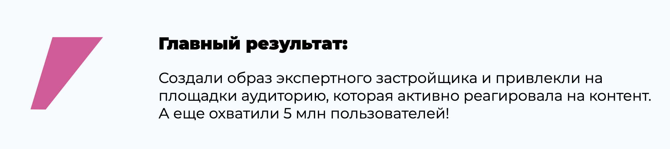Во время работы над проектом, мы регулярно проводили встречи по сверке стратегии, чтобы оперативно адаптировать контент и работу команды к изменениям внутри компании. В результате совместной работы мы помогли «Практике» создать образ открытого застройщика, который выполняет свои обещания и ничего не скрывает.