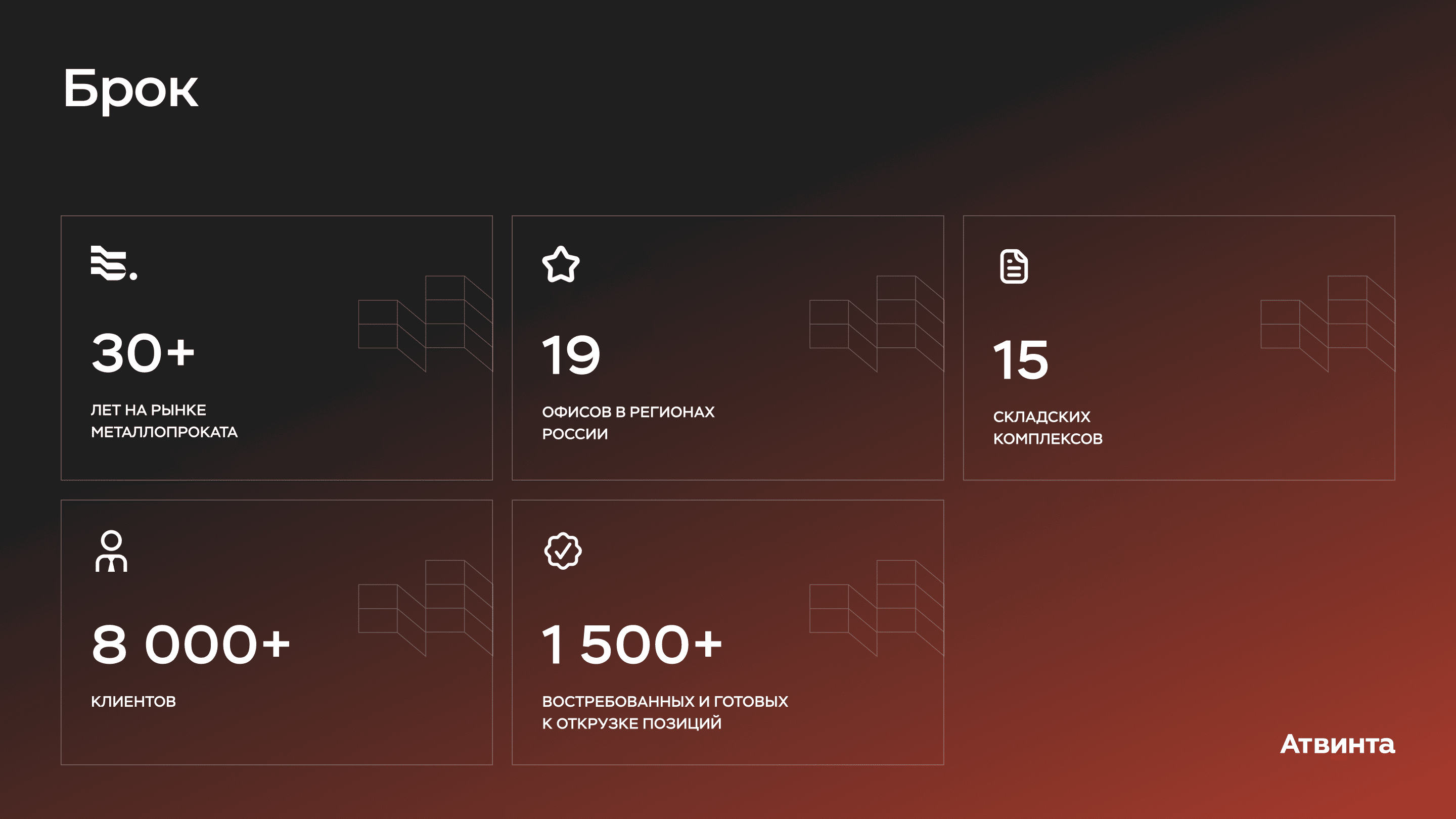 Мы ценим наших партнеров и всегда нацелены на долгосрочные отношения, которые приносят реальную пользу бизнесу. Средний срок работы клиентов с Атвинтой составляет пять лет, и мы готовы поддерживать развитие Брока на каждом этапе их цифрового развития.