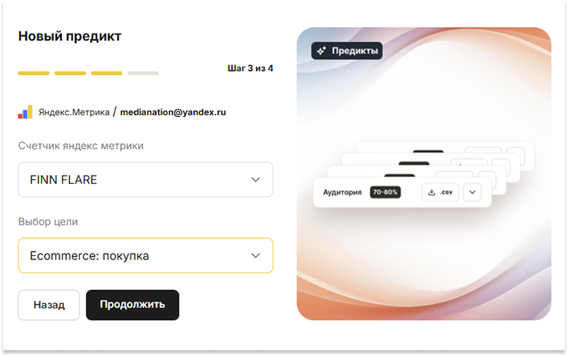 Данные использовали для формирования сегментов покупателей в зависимости от вероятности выполнения целевого действия. Затем полученные сегменты загрузили в «Яндекс Аудитории».