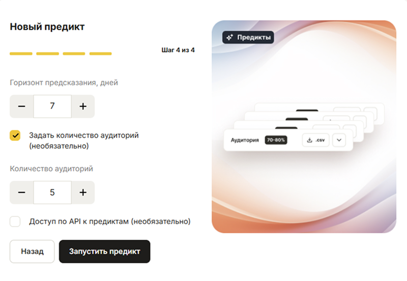 *Дополнительно можно задать желаемое количество аудиторий с пользователями после обучения системы, включить доступ к API (Application Programming Interface — набор правил, по которым приложения или части программы общаются друг с другом) и получать значения прогноза по конкретному пользователю через API-интеграцию.
