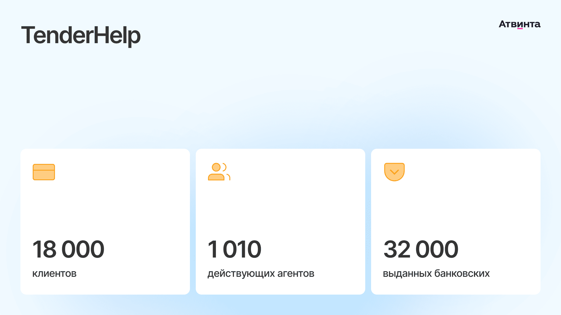 TenderHelp входит в топ-5 брокеров в своей отрасли и сотрудничает с более чем 20 банками. Менеджеры обработали через сервис запросы свыше 18 000 клиентов и выдали 32 000 банковских гарантий.