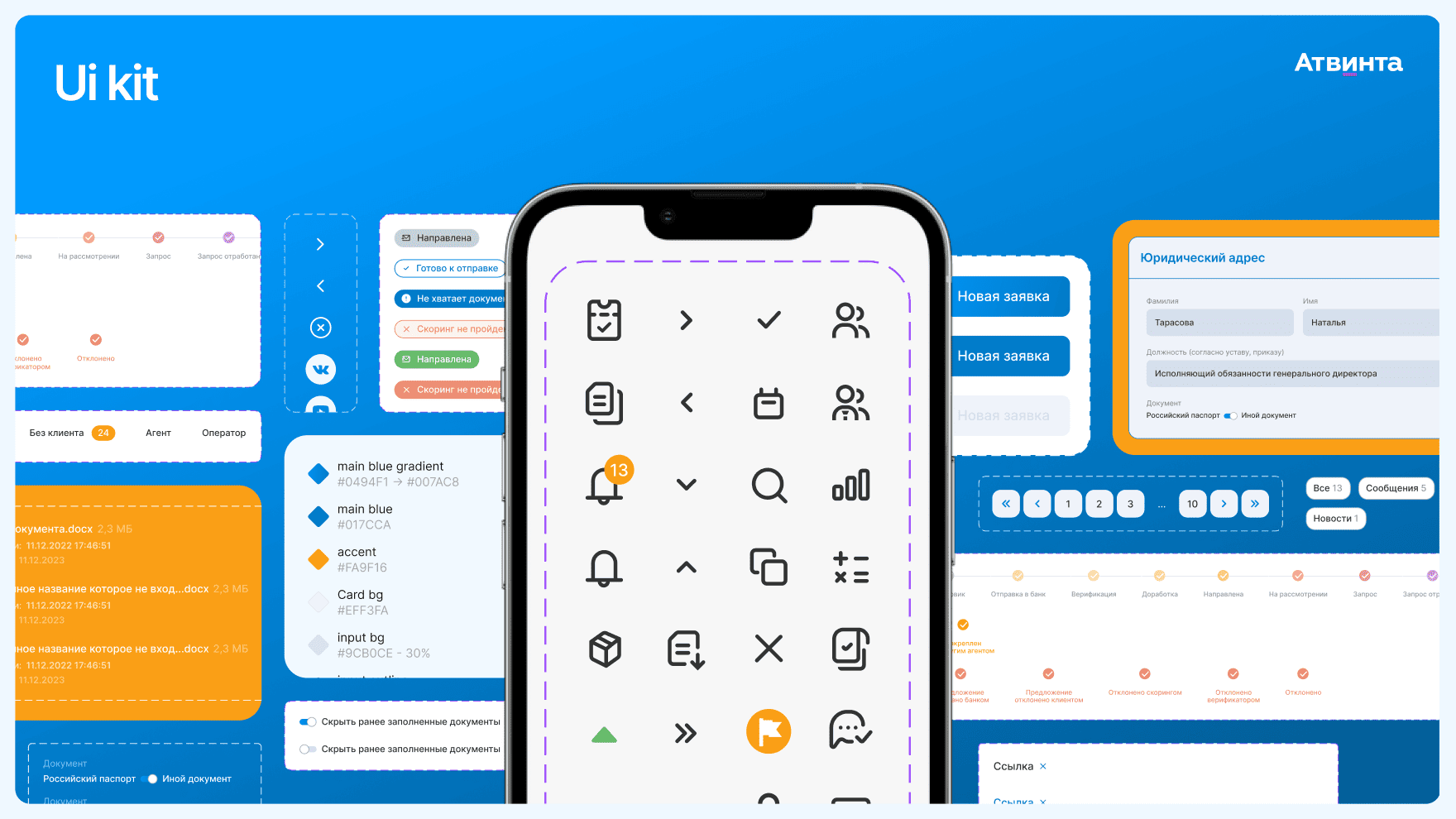Компоненты UI kit подробно описаны и подготовлены к внедрению: цвета, интерактивные состояния кнопок, поля, чекбоксы, статусы, уведомления и система шрифтов и отступов.