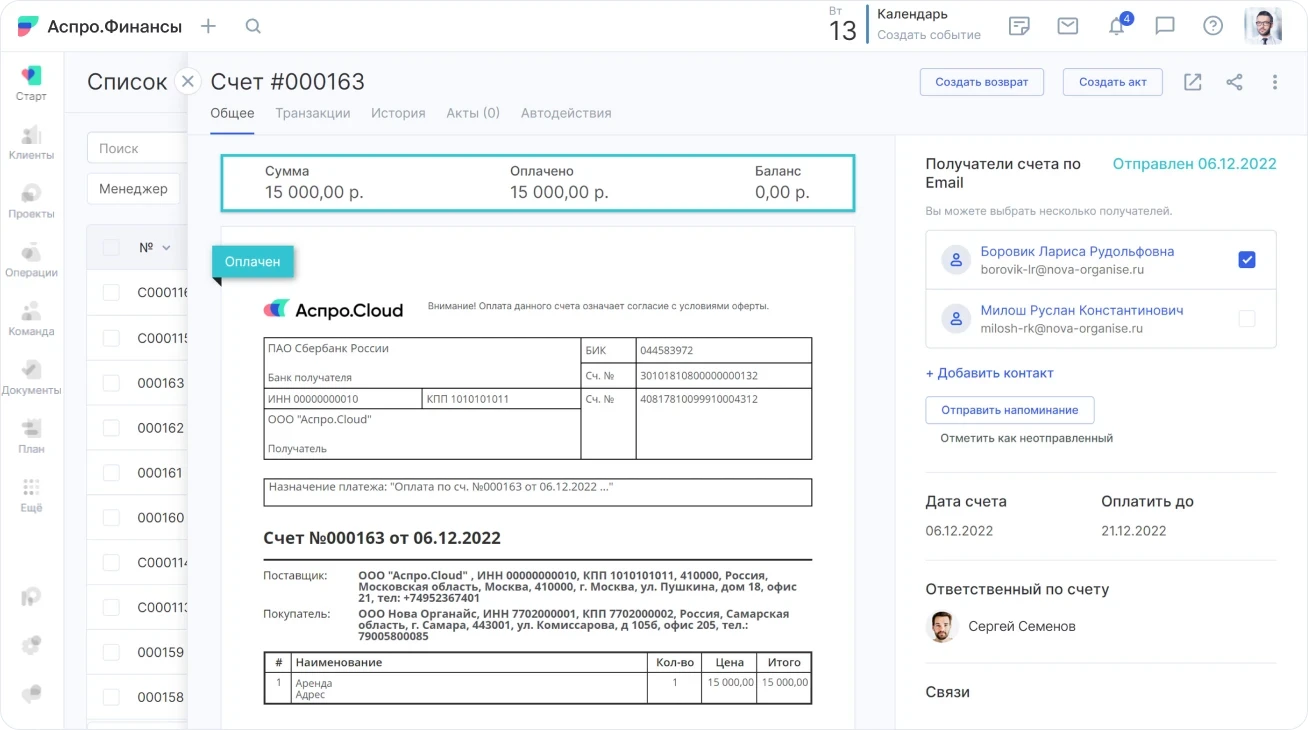 Формирование и отправка счета с актом теперь занимает не больше минут. Проектный менеджер может сразу увидеть статус оплаты и при необходимости вернуться к клиенту.