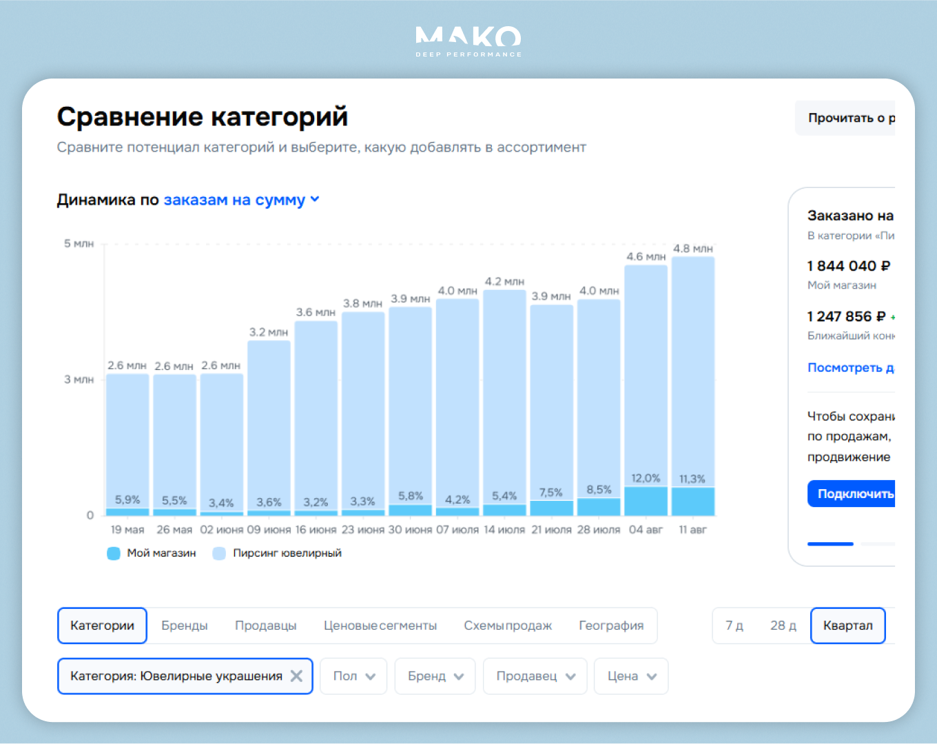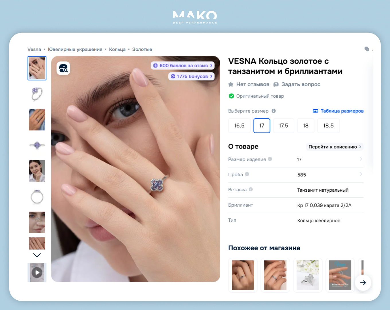 — Хотим с помощью МАКО уверенно зайти в эти категории. Понадобится помощь агентства с планированием поставок: у каждой модели колец свой размерный ряд, важно поддерживать остатки в нужном количестве, но без перегрузок.