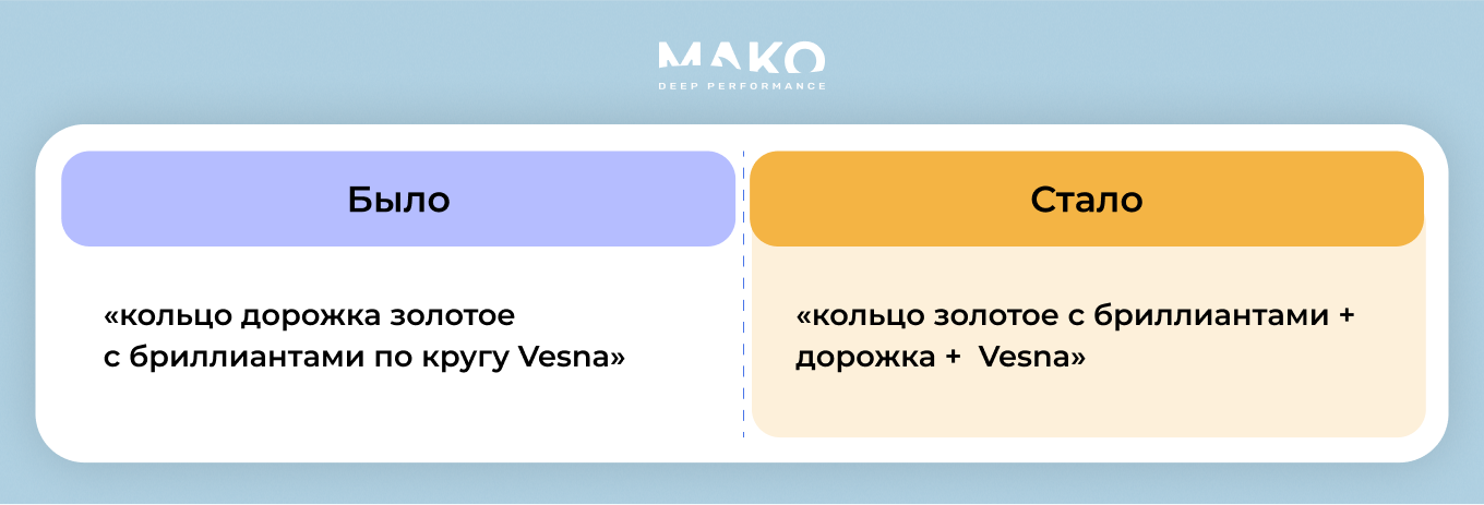 Для каждой категории украшений разработан свой шаблон. За основу брали высокочастотный релевантный запрос, по которому чаще всего покупают. К нему добавлены другие характеристики товара.