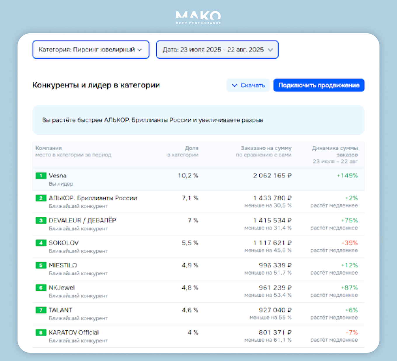 Лидирующие товарные группы Весна на маркетплейсах — ювелирный пирсинг и моносерьги. Мы прокачиваем эту категорию по причинам. Во-первых, получает много откликов от покупателей, что у других брендов нет такого выбора. Во-вторых, пирсинг и моносерьги с бриллиантами — самое доступное по цене в нашем ассортименте. Такие товары могут стоить 5-10 000 рублей и пользоваться спросом у массового покупателя.