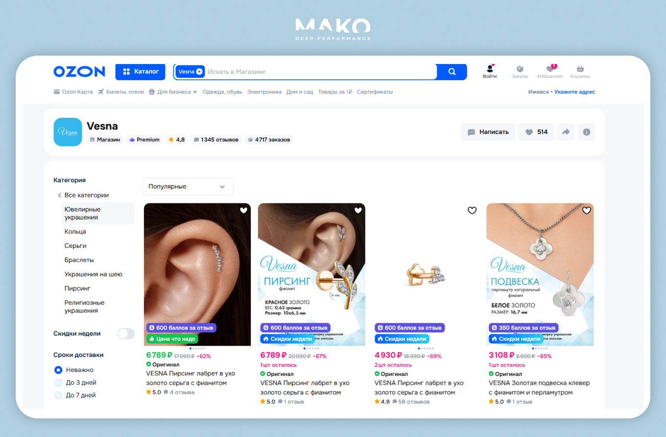 Высокие чек и длительный цикл сделки. На Ozon бренд Весна продает украшения от 8 000 до 80 000 рублей. Такие покупки не делаются спонтанно. Люди долго присматриваются и выбирают: между первым переходом в карточку товара и заказом может пройти 2-3 недели.