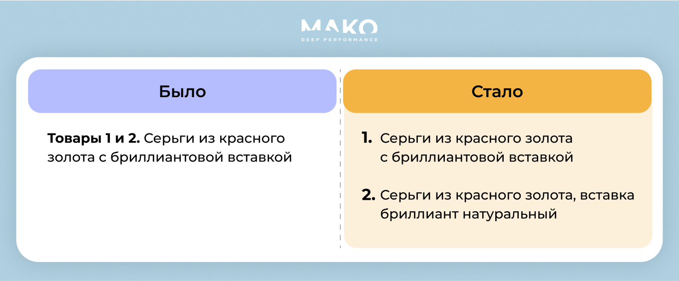 Тогда придумали лайфхак для обхода ограничений: поменяли описания и характеристики похожих товаров, чтобы они немного выделялись.