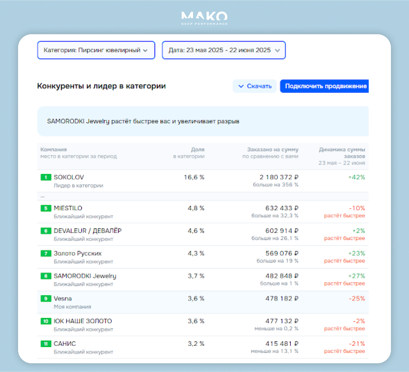 Бренд Vesna поднялся в рейтинге ювелирных магазинов Ozon по выручке на 65 позицию и поднялся со 170 на 106-е место.