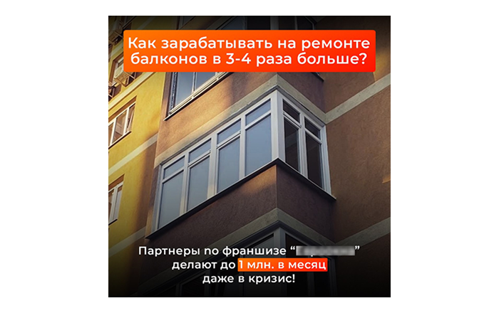 Креативы для рекламных франшиз по остеклению балконов должны привлекать предпринимателей, а не конечных клиентов. Показывать, что нужно не просто красивые балконы, а бизнес-потенциал: успешные франчайзи, поддержка компании, готовые проекты, команда.