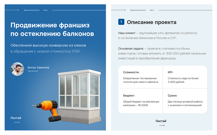 «Привет! Меня зовут Антон, я таргетолог. В нашем агентстве мы постоянно работаем с проектами по продвижению франшизы. Для этого клиента, продвигающего франшизу на остекление балконов, через ВКонтакте, прекрасная конверсия из кликов в обращение с низкими затратами стоит 170р»