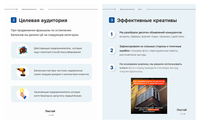 «Продвижение франшиз — моя основная специализация. Имею опыт работы с различными нишами, от массажных салонов до компаний по остеклению балконов. узнать подробнее о других проектах можно здесь »