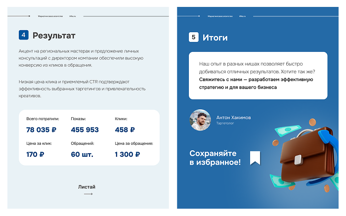 Тестовая рекламная кампания по продаже франшиз на остекление балконов показала отличные результаты благодаря персонализированному подходу и сосредоточению внимания на трех ключевых сегментах рынка. Акцент на региональных мастерах и Совете директоров компании, предложенный директором компании, привел к конверсии кликов в обращении. Низкая цена клика и приемлемый CTR подтверждают эффективность выбранных таргетинга и привлекательность креативов.