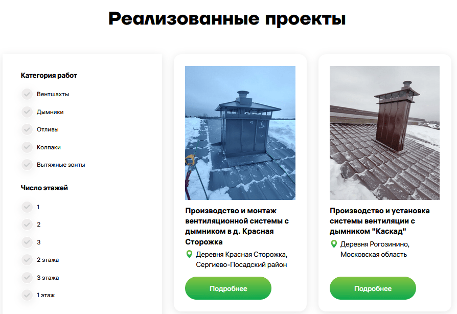 Такое большое разнообразие кейсов нужно, чтобы сайт «вентшахт» появлялся в поиске при самых узких запросах. Например, когда человек ищет подрядчика в своей деревне или на определенный тип работ.