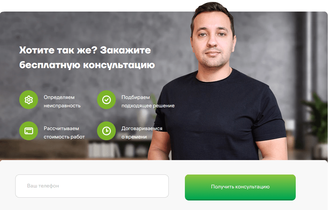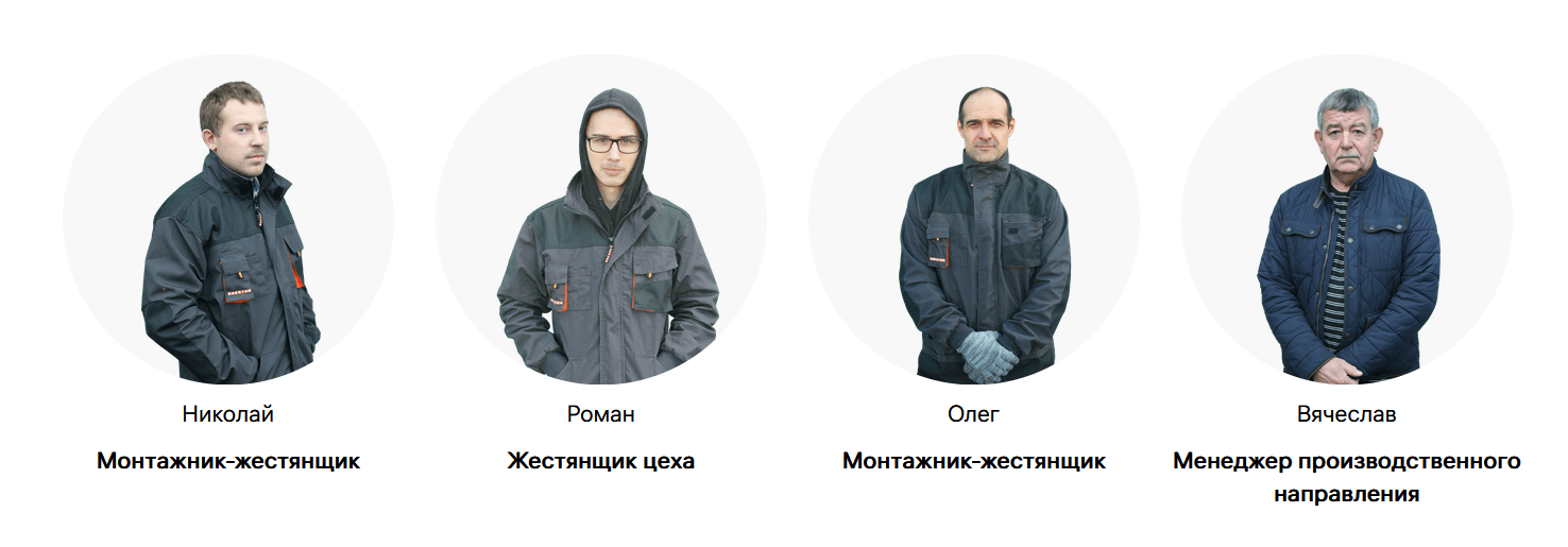 Часто на подобных сайтах размещают идеальные фотографии качков в комбинезонах. Вместо этого мы разместили честные фото сотрудников — это вызывает больше доверия.