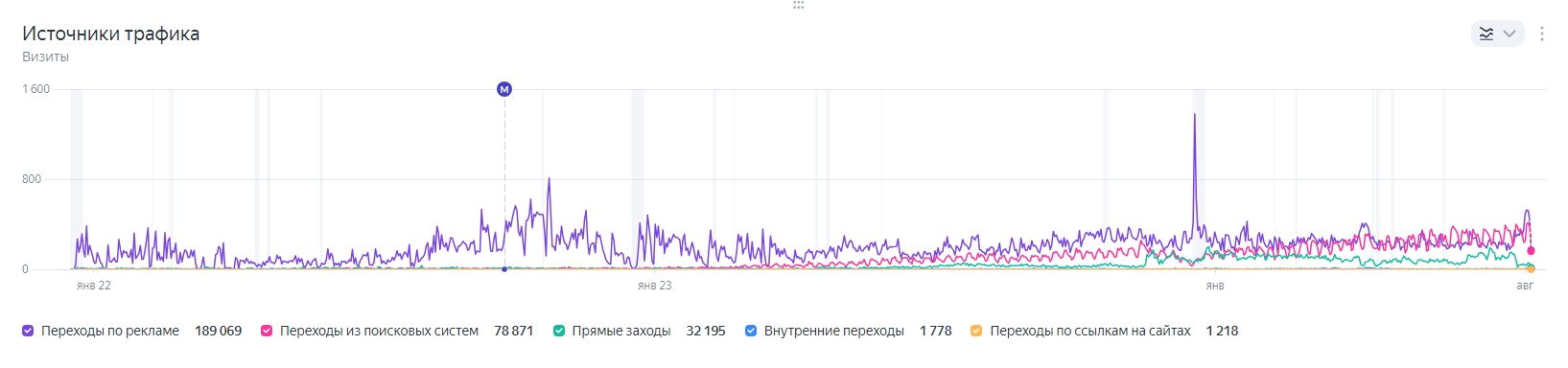 Блог — один из главных источников посещений на сайте, он приносит в разы больше трафика, чем другие каналы. На графике переходы из блога показаны высокими столбцами