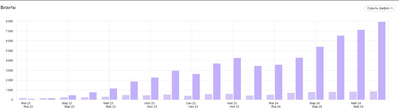 Работы по SEO в сочетании с контекстной рекламой дали отличный результат. Раньше на сайт клиента заходили лишь 200 посетителей в месяц, из которых только половина оказывались целевыми. Сейчас трафик разогнался до 8000 гостей ежемесячно — это в пять раз больше, чем ожидал заказчик.