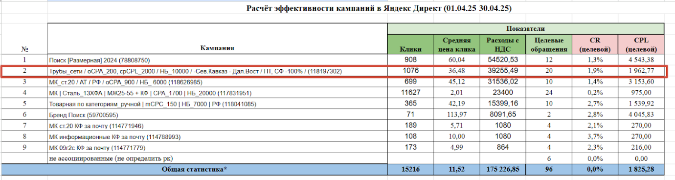 Осталась задача сохранить старые показатели в цене лида трубного проката. Увеличение прироста стоимости лида бывает, когда после изменения темпов роста проекта становится конкурентоспособным. Это риски и снижение качества трафика, а, следовательно, и качество личного обращения. Часто при изменении нарушают обучение в успешных рекламных кампаниях, и зачастую прежний сложный результат сохраняется. Также стояла задача учитывать не только приоритеты продвигаемой продукции, а еще и постараться сделать акценты на маргинальных позициях.