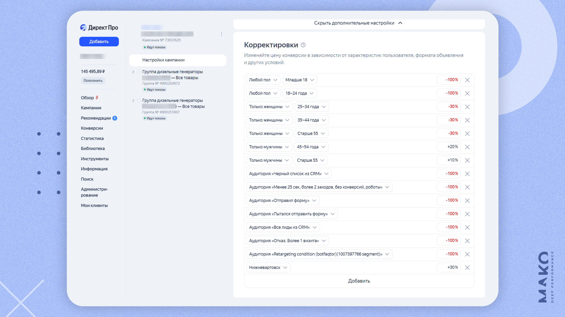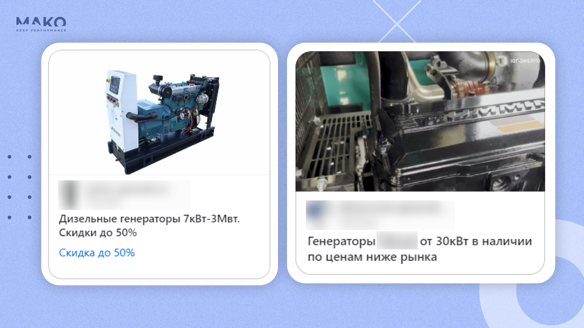 Для достижения этого эффекта мы вручную настроили приготовление цели. Выбирали в Метрике сегмент ЦА, например, человек перешел на страницу дизель-генератора 100 кВт и не оставил заявку. Прописывали в обеспечении, чтобы алгоритмы показывали ему объявление именно об этом генераторе мощностью 100 кВт и вели на странице с ним же. Соответственно, в одной ретаргетинговой РК у нас были сформированы те же группы с сегментацией по производству оборудования: