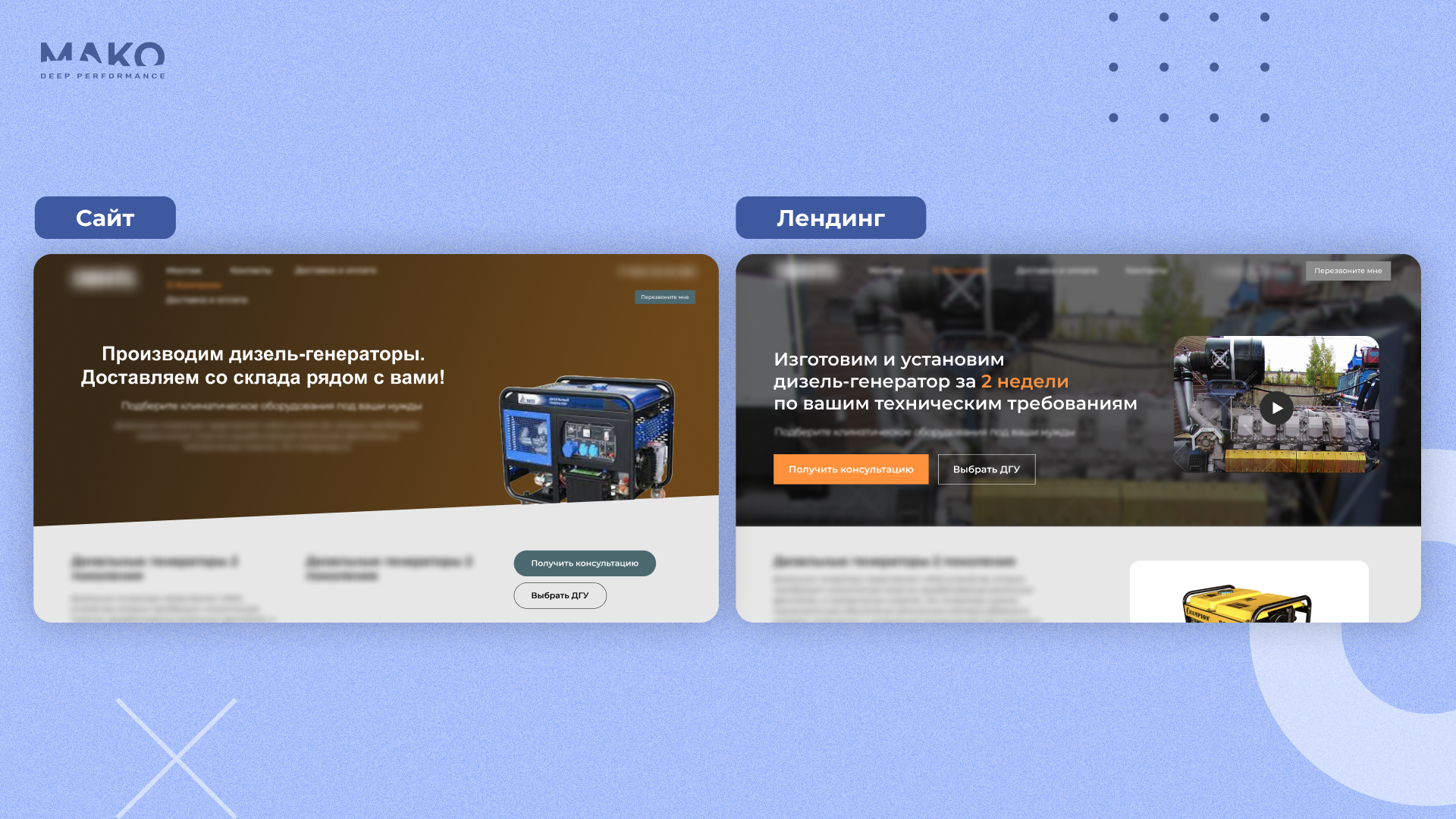 На первых двух экранах сайта в УТП было записано 4 понятия: какой товар, что он от производителя, территориальная доступность и варианты гарантийного обслуживания. И тут же начинается рассказ о том, где применяются дизель-генераторы. Рядом — 2 формы «Получить консультацию» или «Выбрать ДГУ».