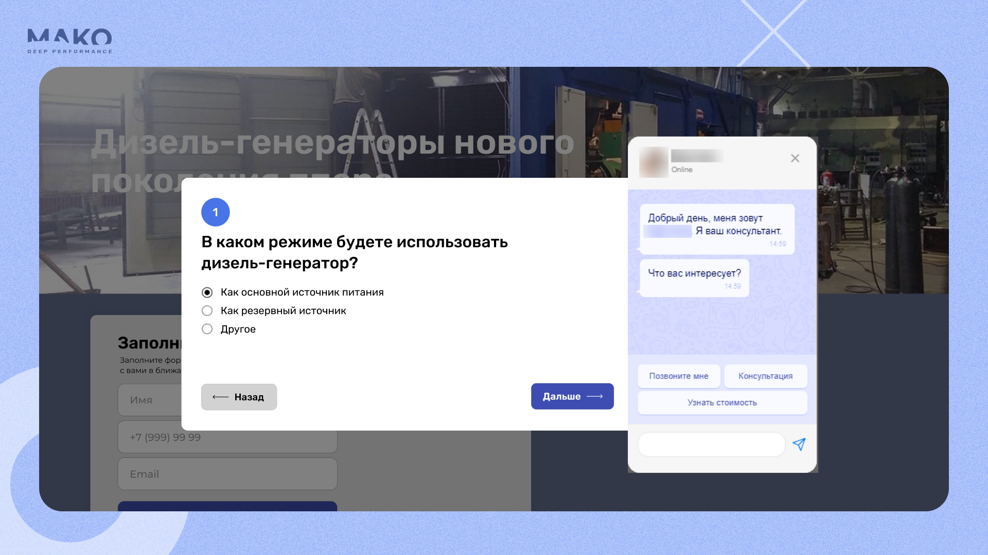 Мы задумываемся, что на данном этапе еще рано уводить нового пользователя в каталог. Требуется еще больше убеждений и полезной информации о преимуществах дизель-генераторов нашего завода. И если больше всего рассказать обо всех преимуществах, конверсия в заявке увеличится.