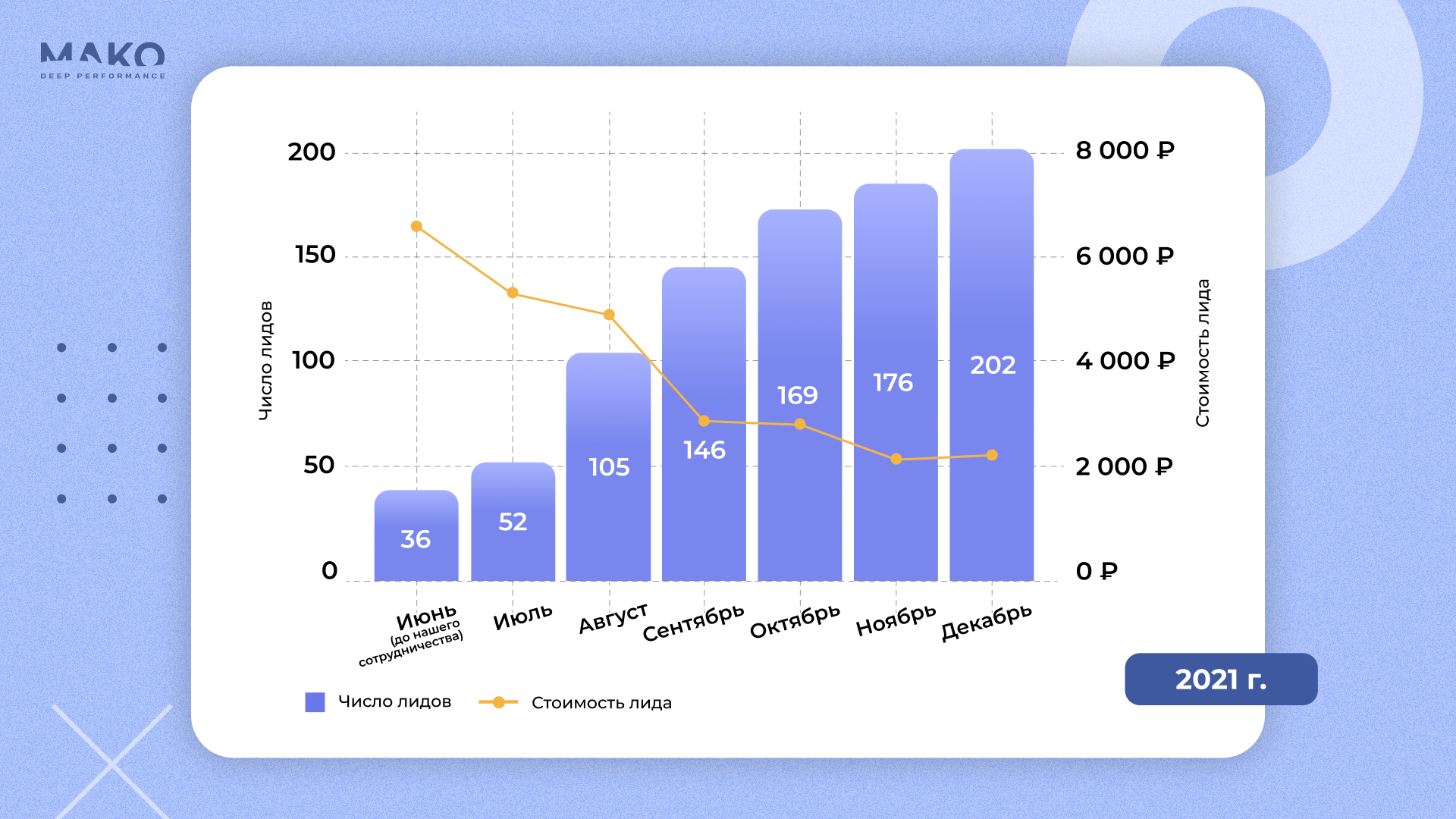 Благодаря этому прорыву уже в декабре 2021 г вышел на уровень: 202 лида за 2265 р. Есть увеличение количества заявок в 5,6 раза, CPL снизился в 3 раза.