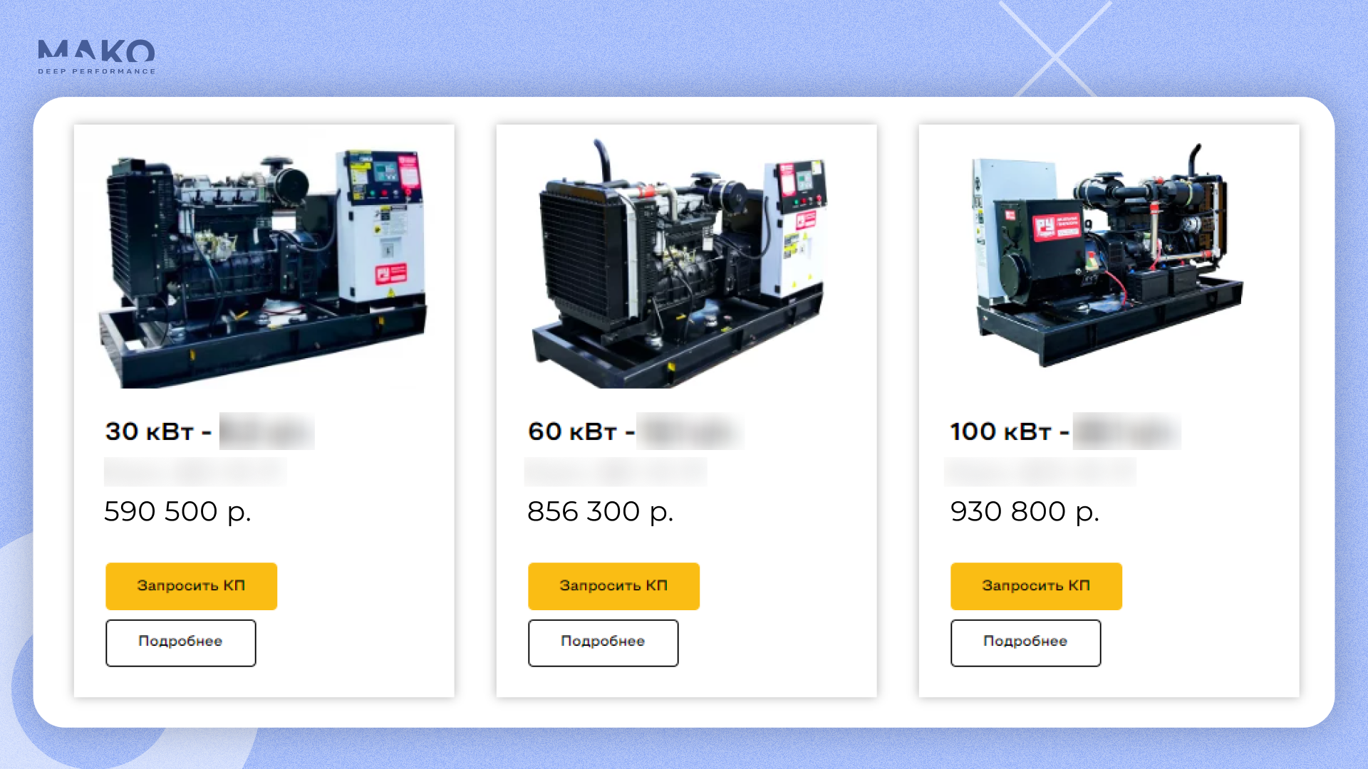 Поэтому мы разрабатываем рекламные кампании, сегментированные по видам и мощностям (дизельный генератор 30, 60, 100 и т. д. техники) и большое количество пользователей на соответствующих страницах товаров. Так нам было нужно настроить управление трафиком и перераспределить бюджеты на те сегменты, которые в данный момент продаются лучше.