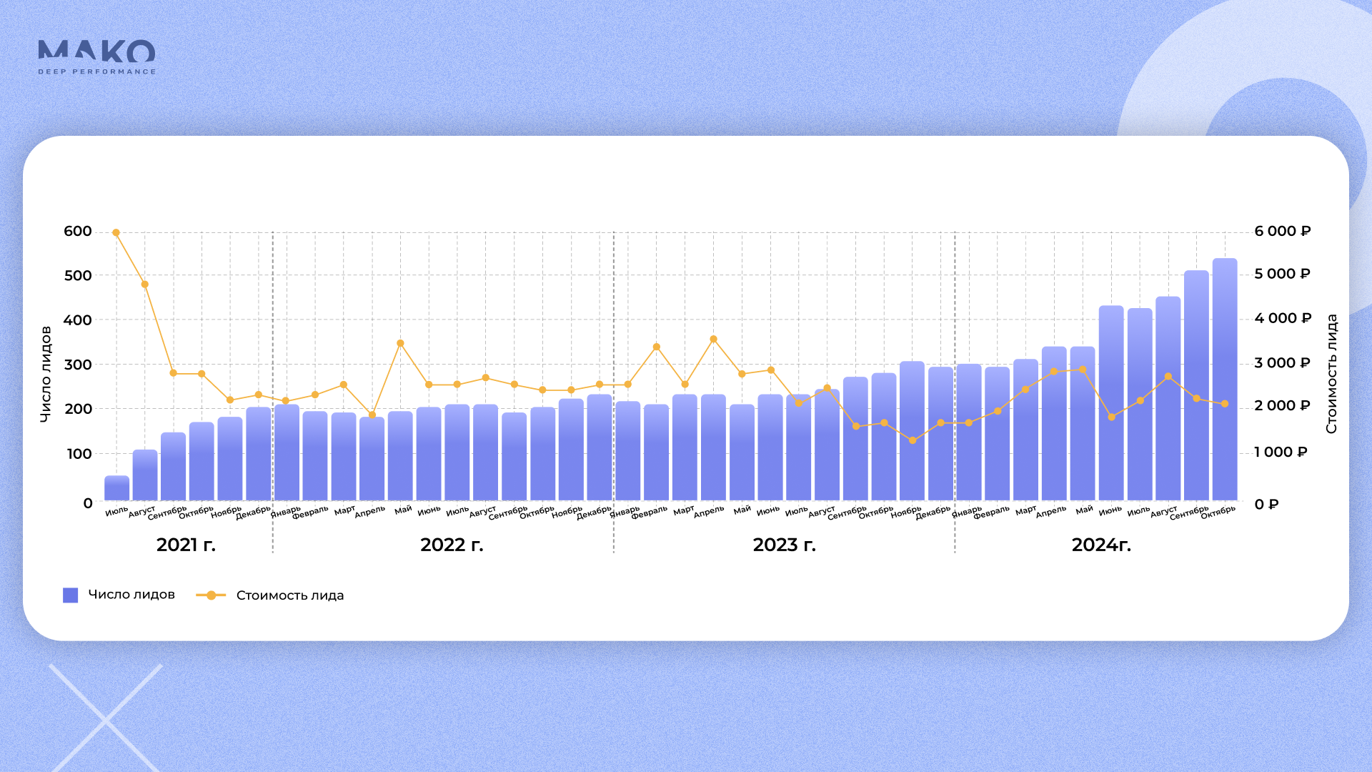 Когда-то завод получил по 36 заявок на рекламу в месяц. Цена их до квалификации была 6000-8000 р., а после — 10 000-12 000 р. Чтобы удержаться на плаву, директор хотел получать от рекламы 120 обращений в месяц. За первые 6-ти месяцев работы мы вышли на 202 лида в месяц с CPL 2265 р. А после масштабирования привело 531 обращение (в октябре) с CPL 2515 р. После квалификации наши лиды стоили 4000-4500 р, что втрое лучше исходных данных. Ниже приводим все показатели проекта: