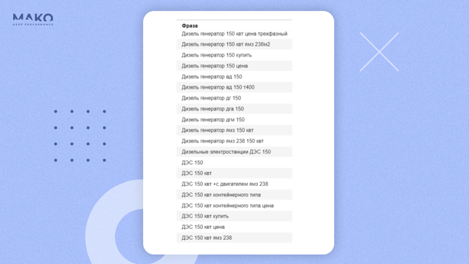 Ювелирно проработали каждый широкий запрос, ведь в этом деле не бывает мелочей. Например, к фразе «Дизельный генератор 150» подобрали близкие и целевые низкочастотные запросы, с помощью которых тоже можно работать: