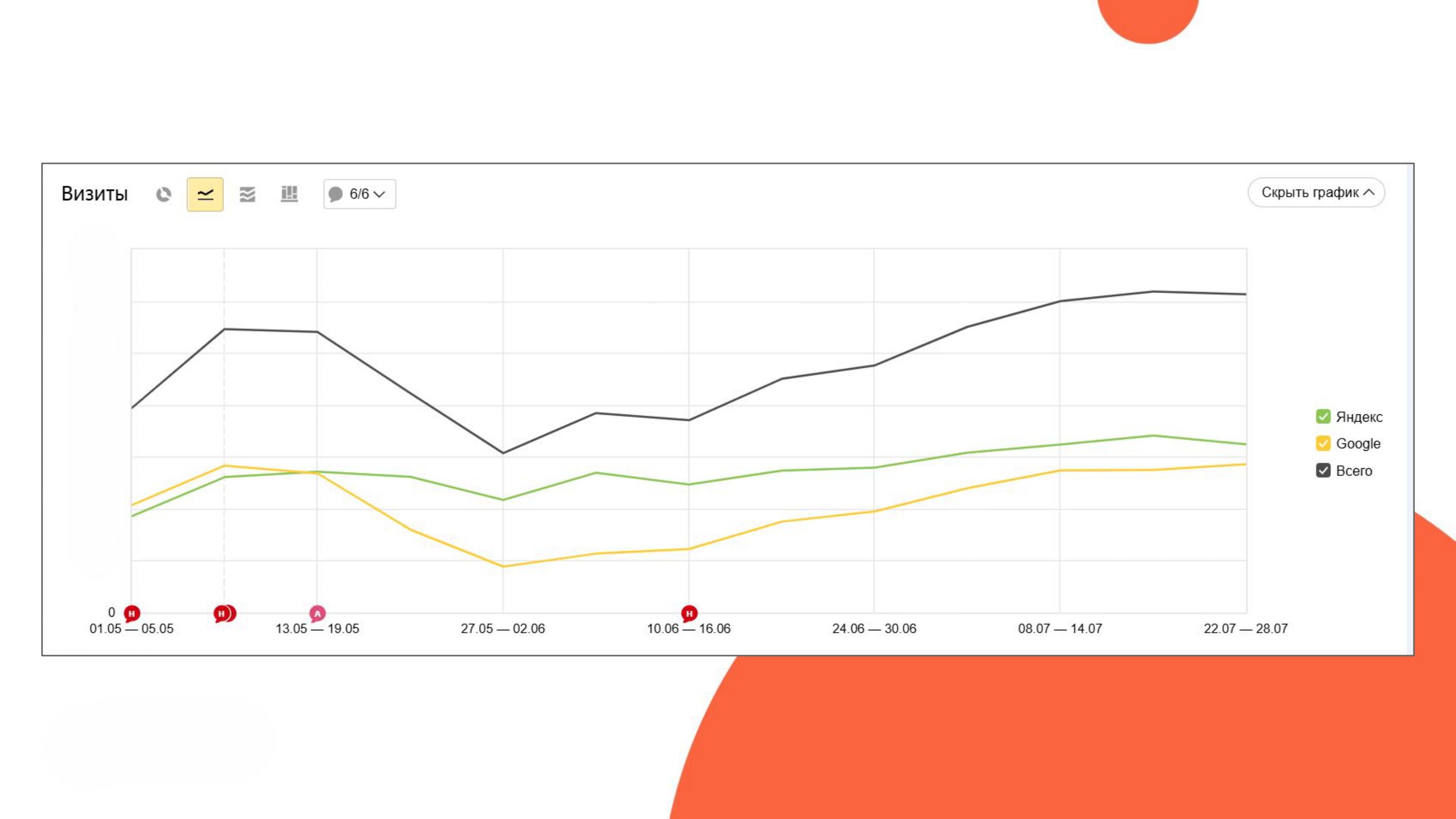 К концу июня мы преодолели просадку, и сайт вернулся к показателям переезда. С июля начинается рост.