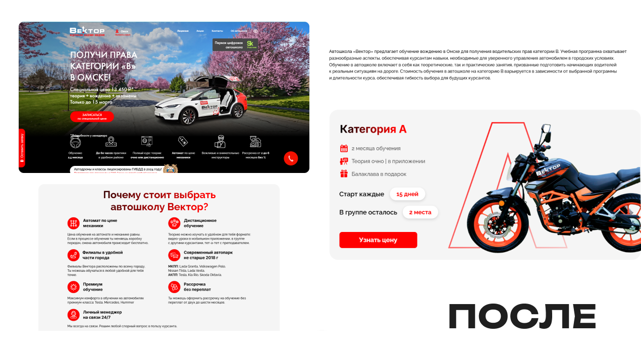 - Отсутствие посадочных страниц: не было отдельных целевых страниц для каждого города и каждой категории прав