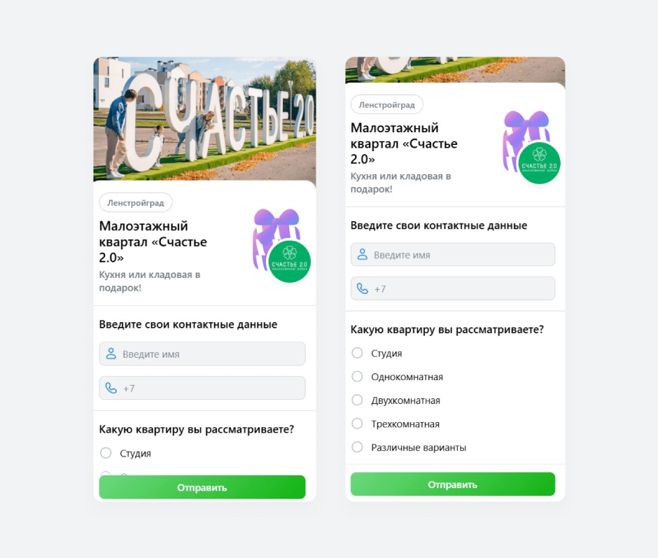 В форму добавлен один обязательный вопрос о желаемом количестве комнат в квартире. В оформлении использован логотип и изображение ЖК. Собрали контактные данные, необходимые отделу продаж для связи с потенциальными клиентами: имя и телефон.