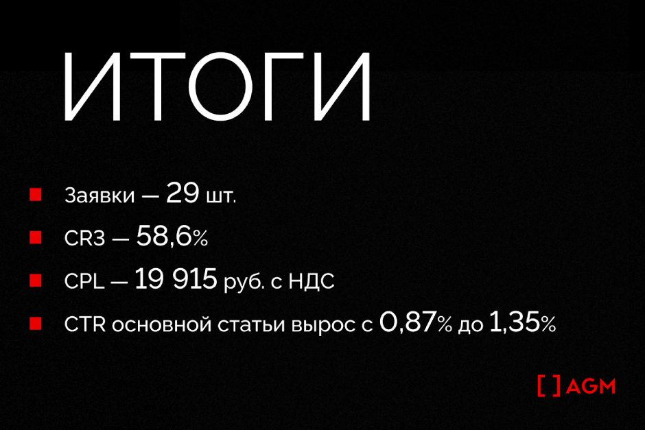 После обновления основных статей запустите два новых инструмента, начиная с первых дней. Уже на третий и четвёртый день пришли первые заявки, которые были проверены как квалифицированные.