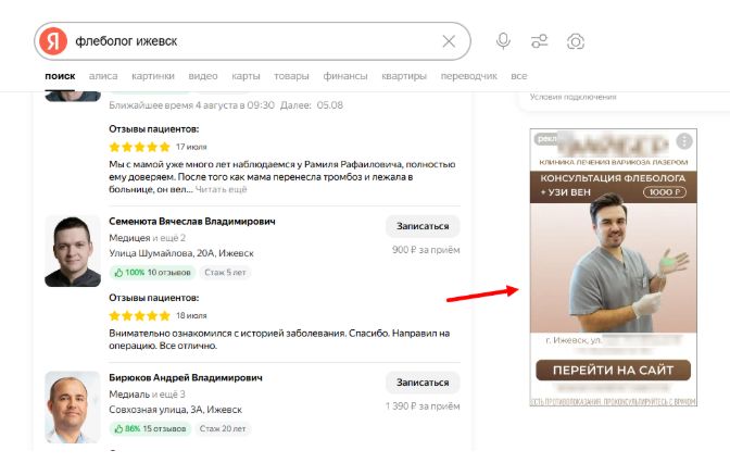 Обычно этот инструмент используется редко: стоимость клика в МКБ выше, чем в других форматах, и не все готовы для таких вложений. Однако в медицинской сфере, особенно в высококонкурентной сфере, баннер помогает решить сразу несколько задач: