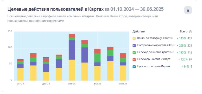 За 8 месяцев работы мы видим рост целевых действий. Удалось повысить количество целевых обращений и улучшить позиции по сравнению с конкурентами, которые не используют этот канал.