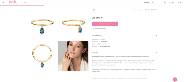 2. Внедрили профессиональную товарную карту. Для каждого изделия создана галерея с высокодетализированными фотографиями и осталось увеличить изображение, чтобы разглядеть украшение в мельчайших деталях. Добавлены подробные описания, подробные характеристики, возможность указать стоимость доставки прямо из карточки товара.