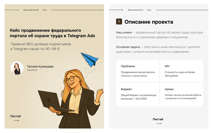 «Привет! Я Таня, таргетолог маркетингового агентства: помогаю каналам в Telegram расти без «сливов» бюджета. В этом кейсе покажу, как с помощью умного таргета, тестов креативов и точной сегментации мы привели 960 подписчиков по цене от 40 до 99 ?»