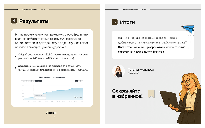 «Этот кейс наглядно демонстрирует, как грамотно спланированная и реализованная рекламная кампания может обеспечить значительный рост числа подписчиков при оптимальном использовании бюджета. Мы уверены, что наш опыт и профессионализм помогут вам достичь подобных результатов. Свяжитесь с нами сегодня, чтобы обсудить ваши маркетинговые цели и разработать эффективную стратегию для вашего бизнеса»