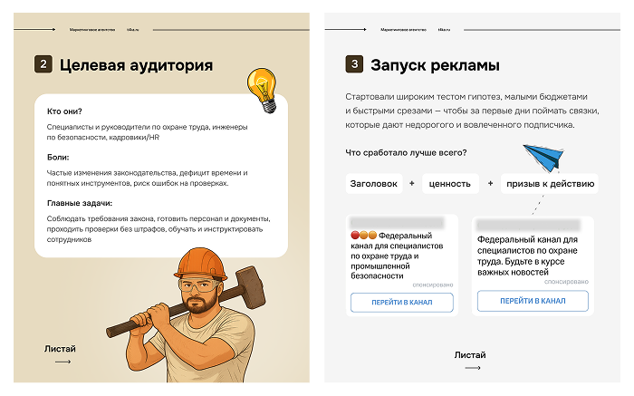 Прежде чем включать бюджет, мы провели короткий подготовительный спринт: изучили профильные каналы и интересы ЦА, собрали пул тем для объявлений (разборы изменений в законодательстве, травматизм и несчастные случаи, «что делать работодателю», чек?листы и аналитика) и подготовили офферы под каждую тему.