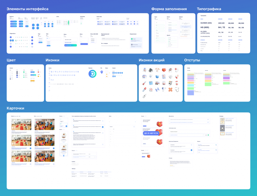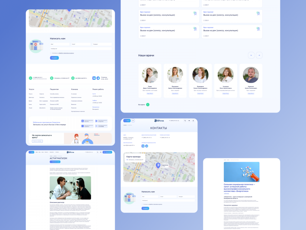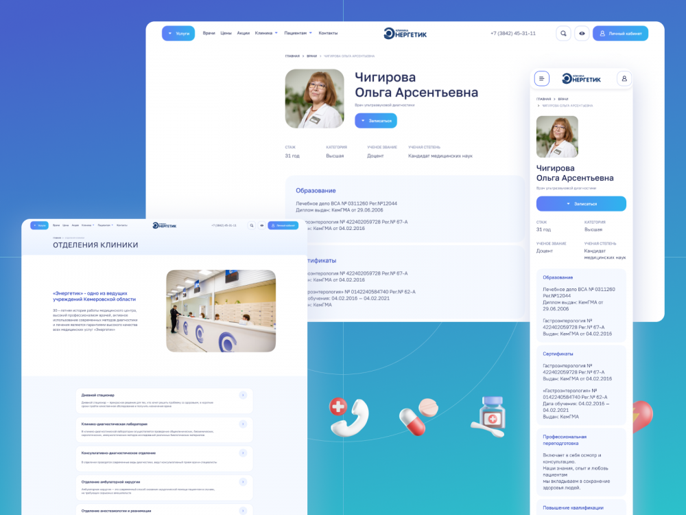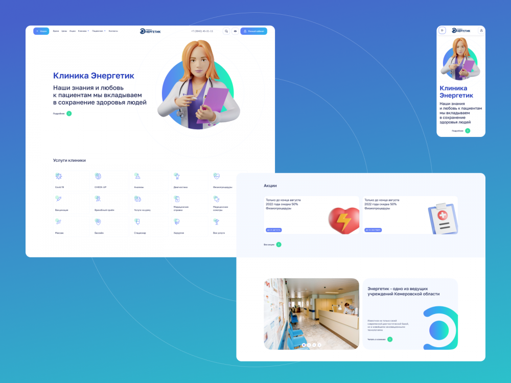 Стилистика нового сайта перекликается с дизайн-системой приложения «Энергетик». Градиенты от бирюзового к синему создают ассоциации с медицинской сферой.