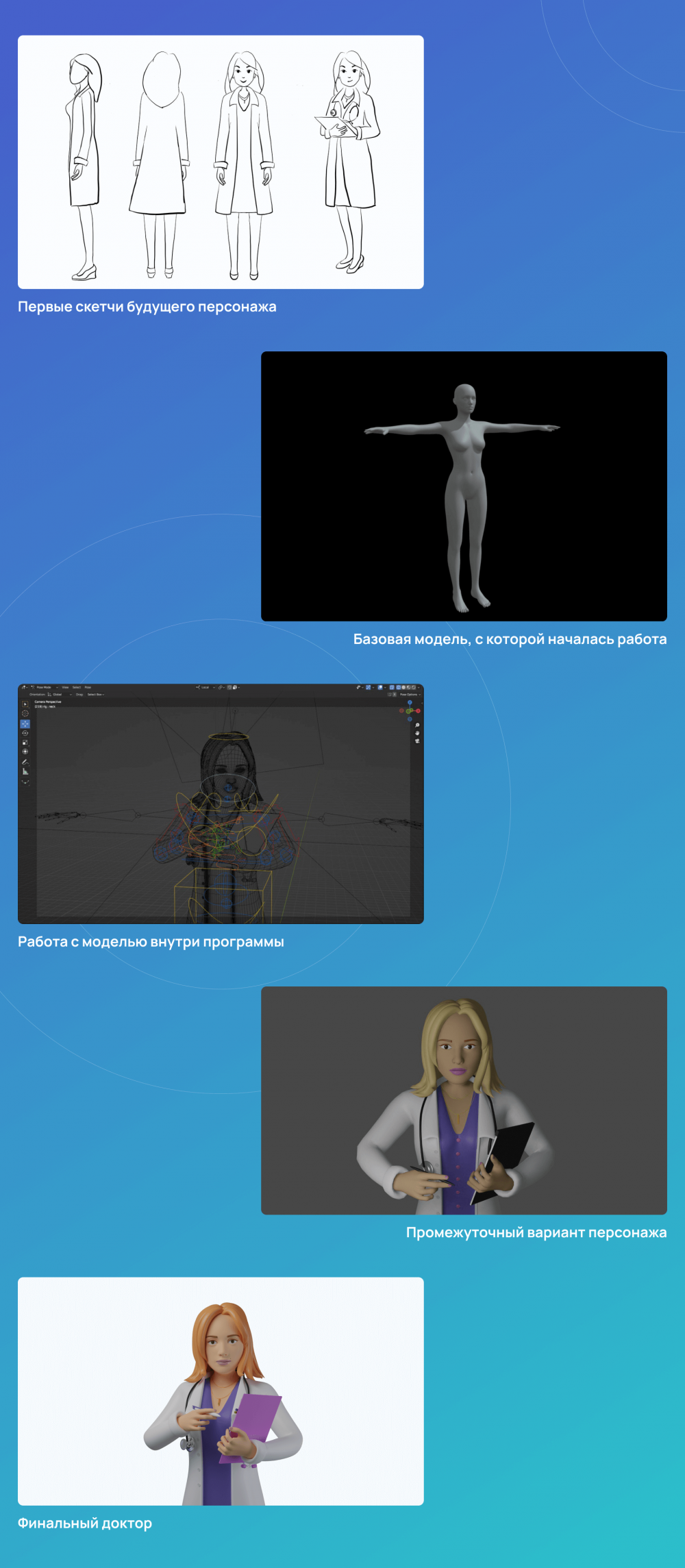 Заказчику настолько понравился процесс создания персонажа, что референсом для него захотелось стать генеральным директором клиники. Так что наш 3D-доктор — прототип реального человека, возглавляющего медицинское учреждение. Эта пасхалка добавила ещё больше «души» и кастомизации персонажа.