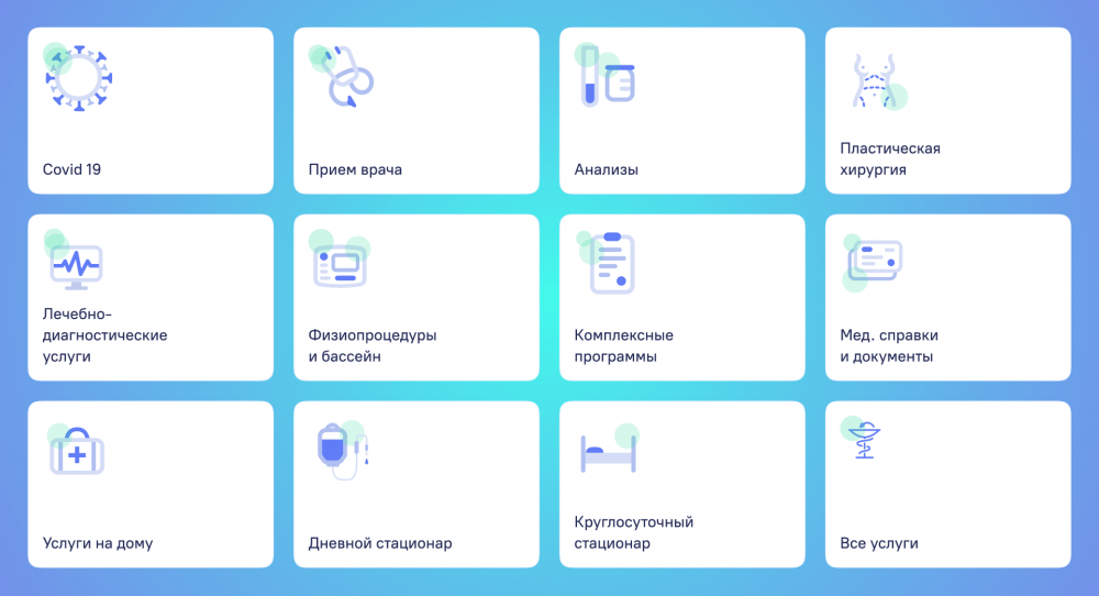 Для каждого раздела услуг на сайте мы отрисовали уникальные иконки. Они помогают ориентироваться в интерфейсе и делают акцент на плашках, которые представлены на следующих страницах сайта.