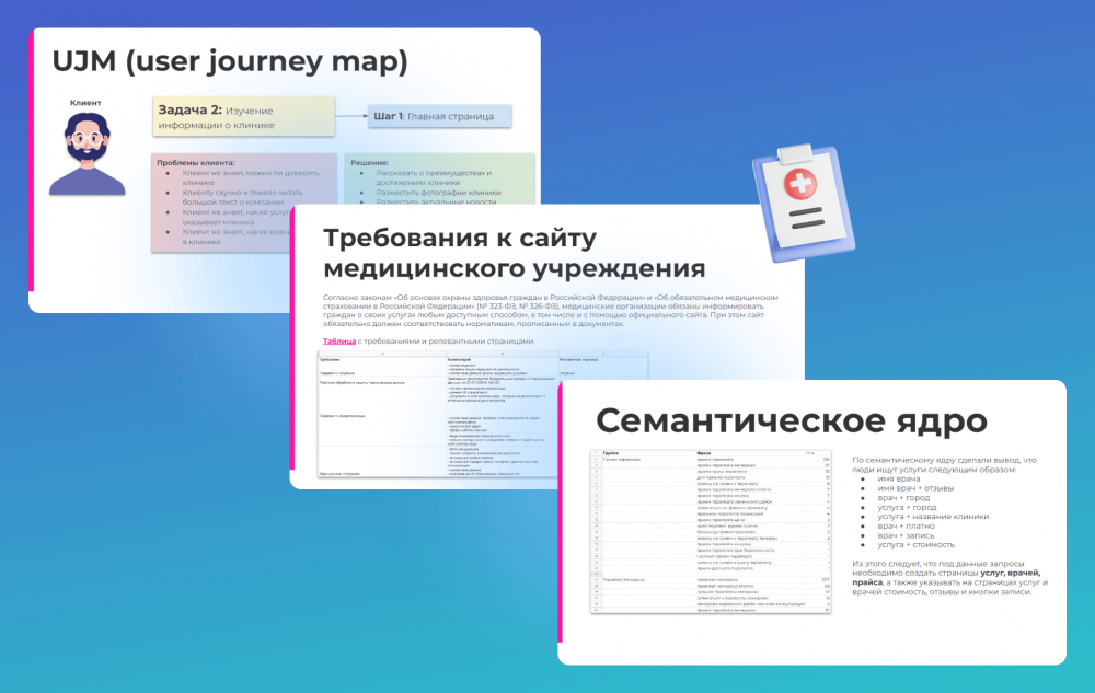 Эта аналитика помогла подготовиться к проектированию и создать сайт, который учитывает параметры пользователей и клиник, позволяет привлечь больше поискового трафика и содержит удобную навигацию и структуру.