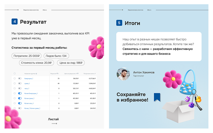 «Этот кейс очевиден, насколько грамотно спланированная и реализованная рекламная кампания может обеспечить устойчивость роста числа лидов при разумном использовании бюджета. Мы уверены, что наш опыт и эффективность помогут вам достичь ни одного результата. Свяжитесь с нами сегодня, чтобы обсудить ваши маркетинговые цели и достичь успеха для вашего бизнеса».