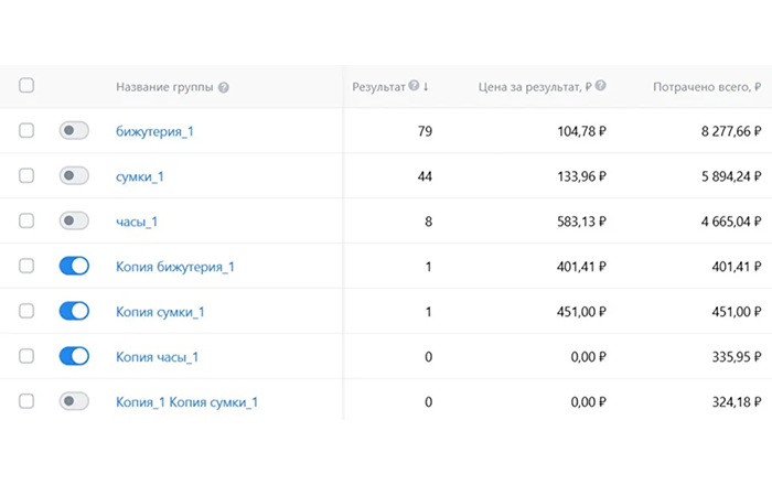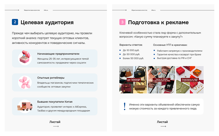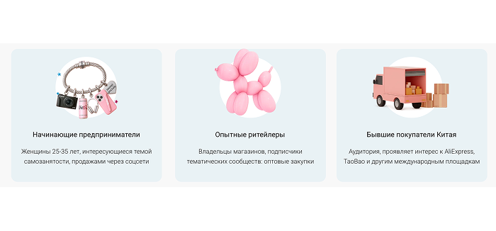 Для масштабирования подключили подобие на основе CRM, чтобы находить людей, наиболее похожих на наших действующих клиентов и клиентов. Для расширения охвата был добавлен таргетинг на соответствующие ниши (оптом-одежда, товары для перепродажи), где часто присутствуют те же предприниматели и ритейлеры.
