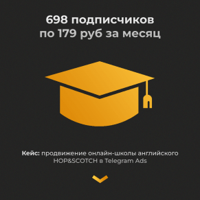 Месяц назад запустили рекламу в Telegram Ads для онлайн-школы английского языка HOP&SCOTCH. Взяли на себя привлечение подписчиков, а заказчик — контент, вовлечение и подготовку к продажам. Потому что одно без другого не работает. Благодаря такому разделению собрали живую аудиторию — тех, кто реально интересуется английским, реагирует на посты и открыт к общению.