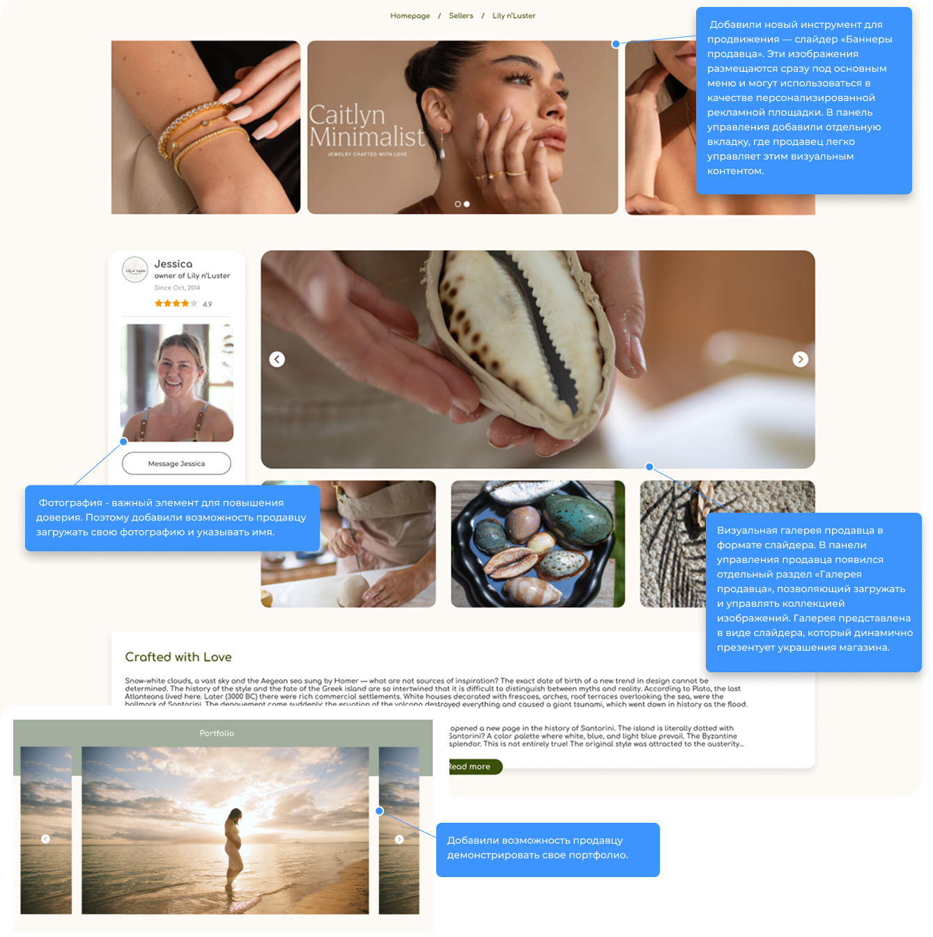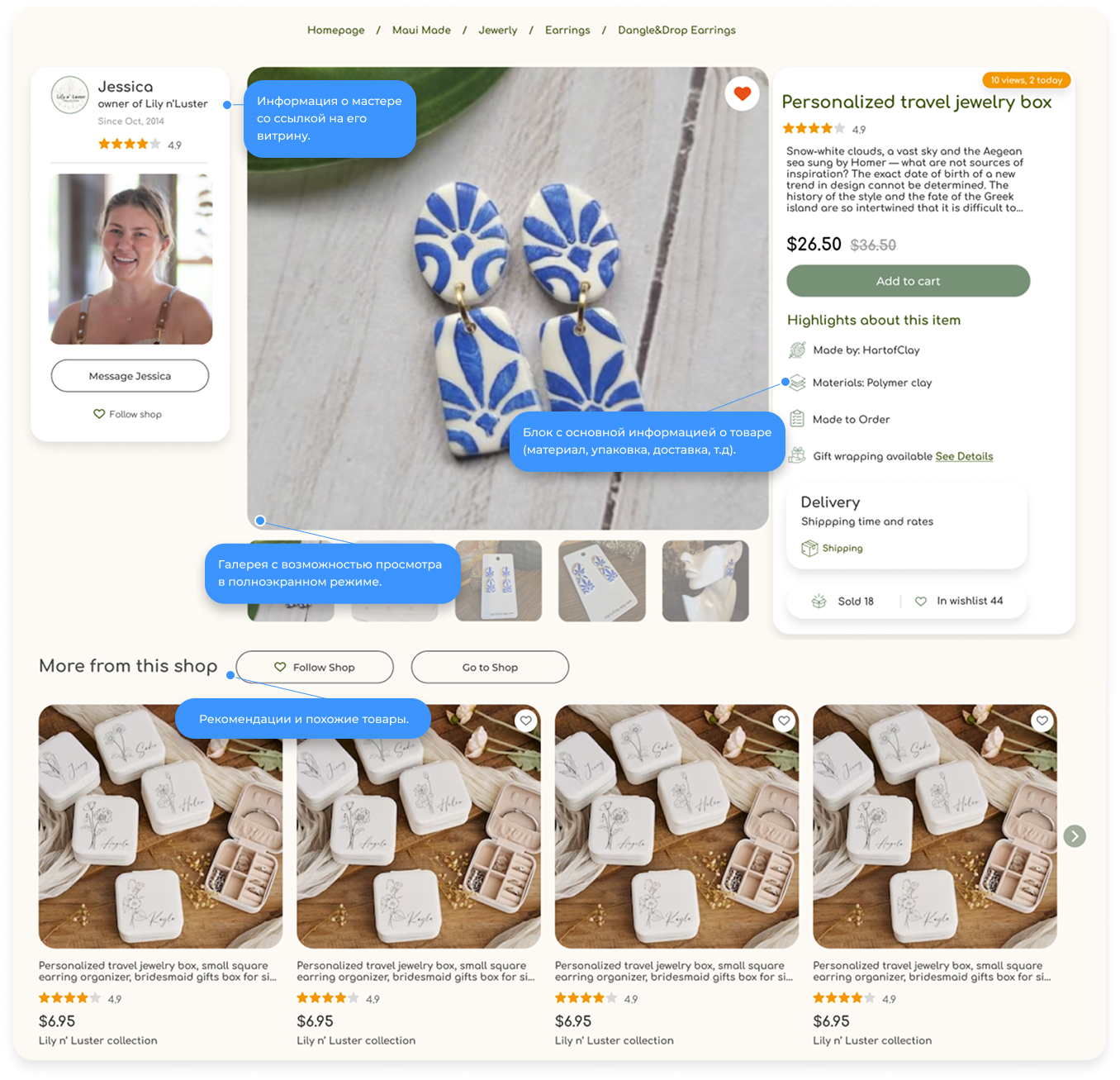 В качестве основы мы взяли примерный макет страницы товара, предоставленный клиентом. Кроме того, мы сохраняем цвета и старый стиль дизайна, поскольку они обозначают тематику маркетплейса товаров ручной работы. Сделали акцент на детализации и истории продукта: