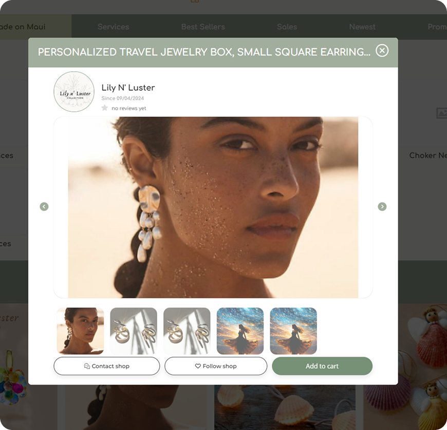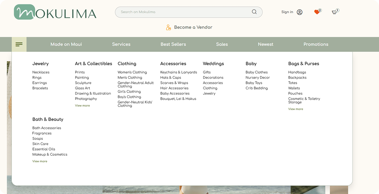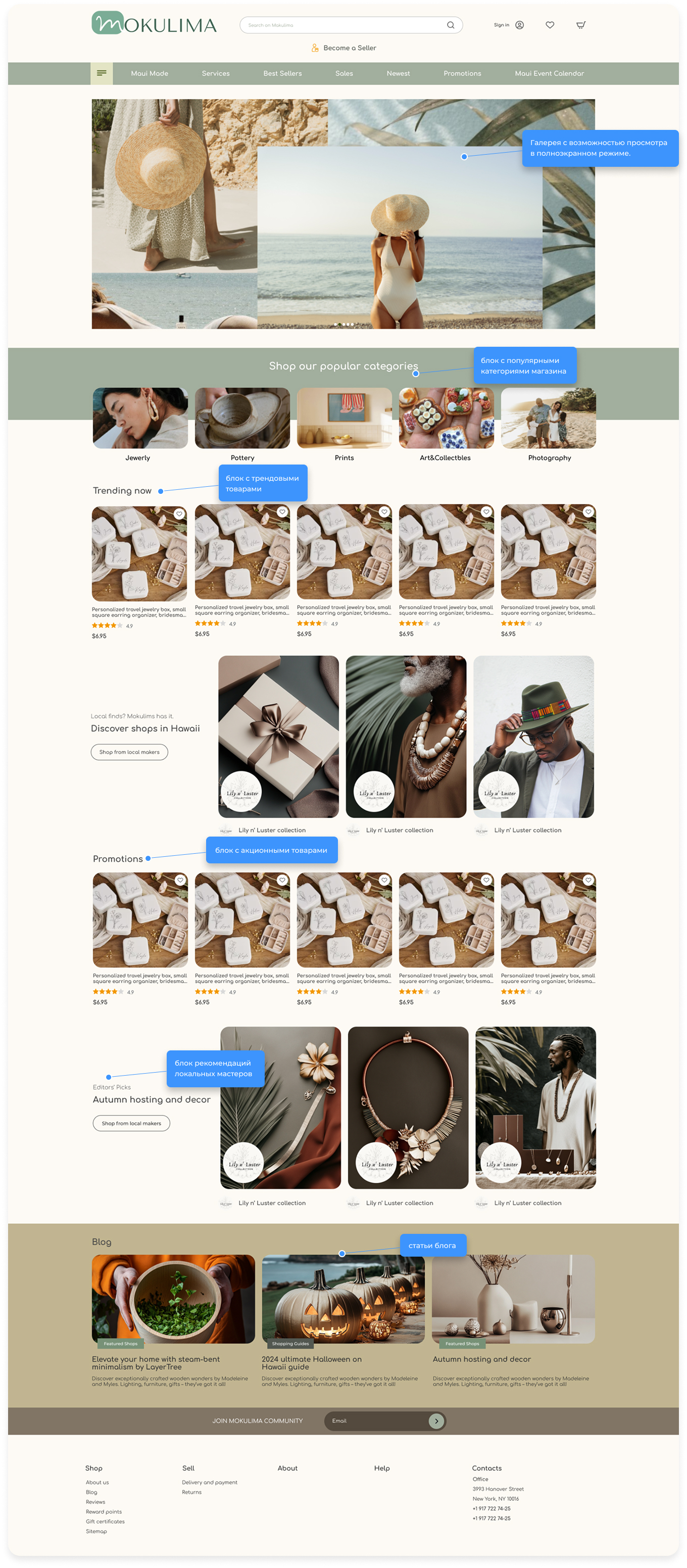 Провели брифование клиента. Это ресурс для максимальной конкретизации целей и задач проекта. Мы также опирались на собственный опыт разработки дизайна сайтов украшений. В качестве референса был выбран клиент маркетплейс Etsy. Нашей стороной было создать аналогичный стиль маркетплейса, локализованный для Гавайева, который передавал курортную атмосферу и местный колорит. В работе мы сделали упор на анализ потребительского пути (Customer Journey), юзабилити, масштабную проработку мобильной версии и сильный визуальный дизайн.