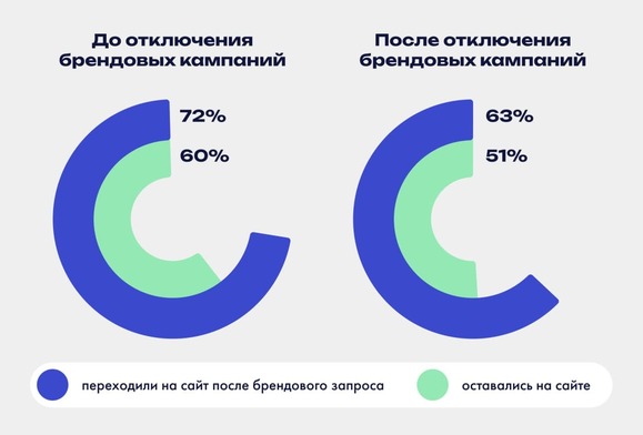 Выяснилось, что брендовые кампании привлекали более заинтересованную в покупке аудиторию. До отключения кампаний на сайт переходили 72,1% пользователей, вводивших название бренда, и 60% оставались на сайте. После отключения кампаний по SEO-ссылкам переходило чуть больше половины (63,5%) пользователей, запрашивающих бренд, и только 51% оставался на сайте. Это говорит о том, что органическая выдача привлекает не только меньшую, но и не столь качественную аудиторию.