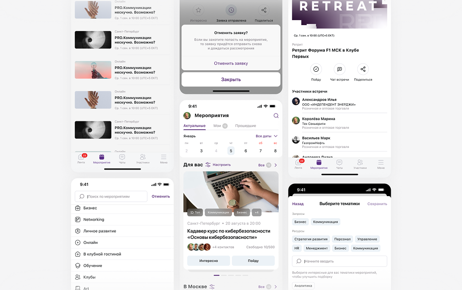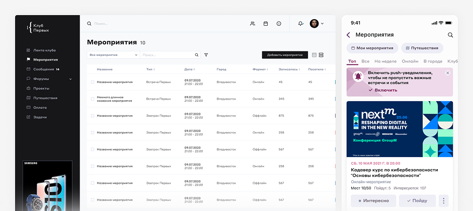 Участники Клуба Первых собираются для знакомства, обсуждения актуальных бизнес-вопросов, презентации своих проектов и многого другого. Все эти мероприятия помещены в один раздел приложения.